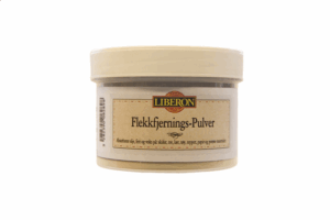 Liberon Flekkfjernings-pulver fjerner flekker av olje, voks, stearin og fett fra skifer, tre, lær, tøy, tepper, papir og porøse materialer.