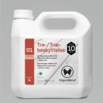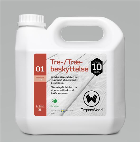 OrganoWood®01. Trebeskyttelse brukes som grunnbehandling av treverk for å beskytte mot flammer og råte. OrganoWood®01. Trebeskyttelse har en blekende effekt og skaper en hardere overflate som er mindre utsatt for sprekker. Et strøk er nok. Treverket skal ikke overmales etterpåføring, vi anbefaler bare overflatebehandling med OrganoWood®02.