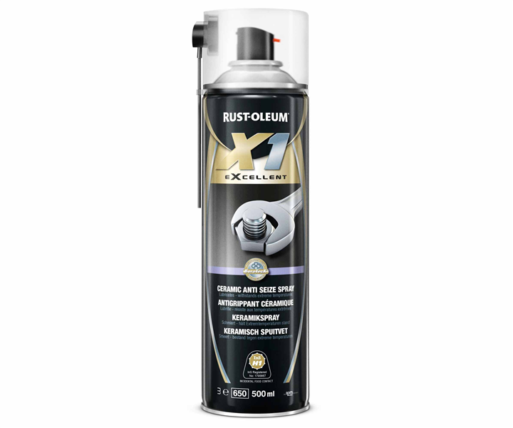 X1 eXcellent Høytemperatur Smørespray fra Rust-Oleum er en keramisk spray som tåler høyt trykk og ekstreme temperaturer. Sprayen er motstandsdyktig, mot vann, vær og kjemiske stoffer. Produktet innholder ikke metall og er ikke ledende. Isolerer og hindrer fastbrenning av ulike typer metall.