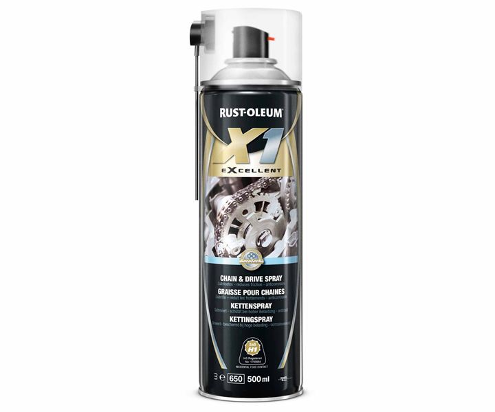 Rust-Oleum X1 Kjedespray er en spray av høy kvalitet til smøring av drev, tannhjul og kjeder. Sprayen gir svært lav friksjon og motvirker slitasje på kjeder og åpne tannhjul som utsettes for stor belastning. Inneholder BorTecX som tåler ekstreme belastninger og temperaturer. X1 Kjedespray har god vedheft, er vannavvisende, motstandsdyktig mot vaskemidler og rustbeskyttende.